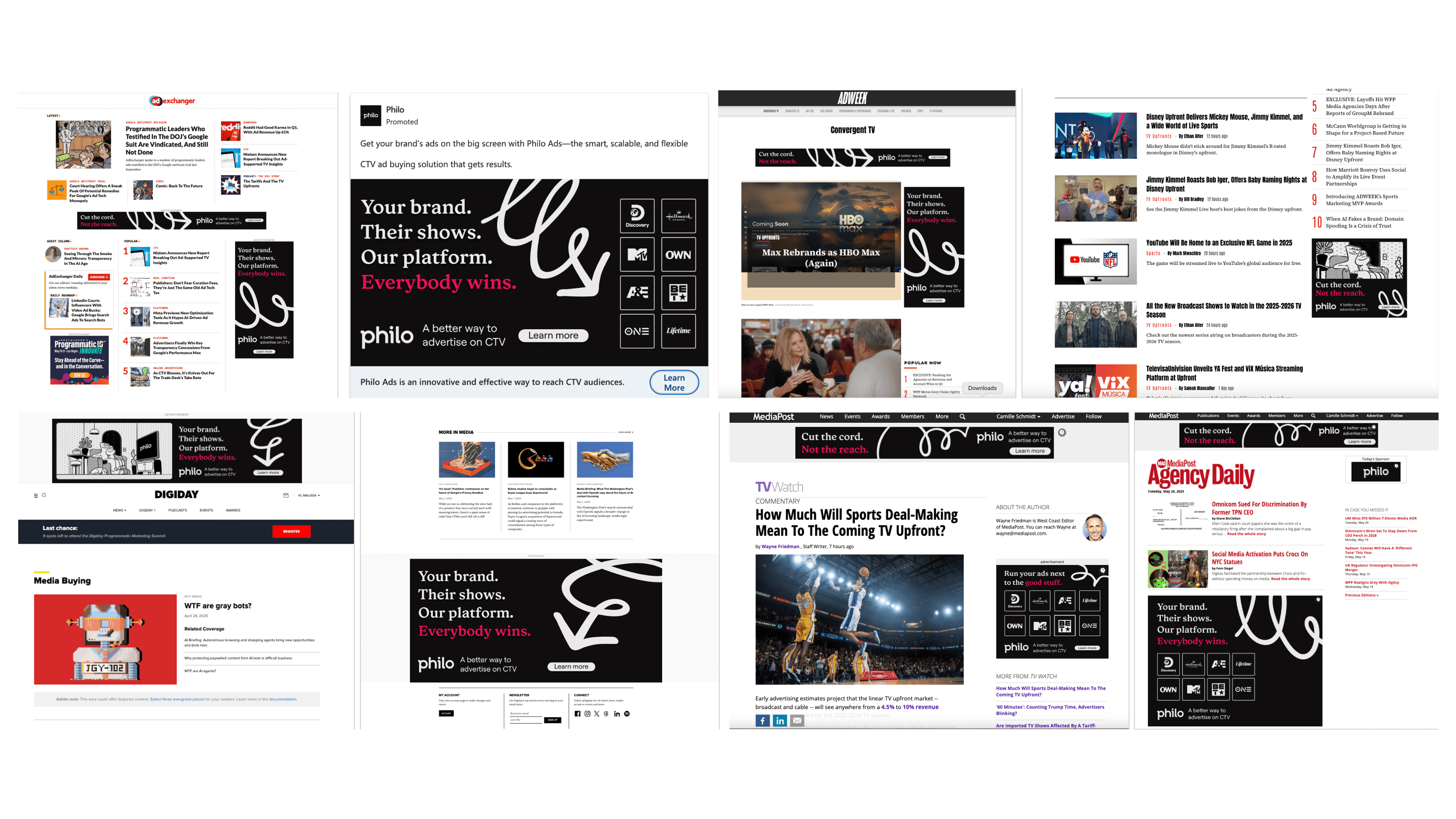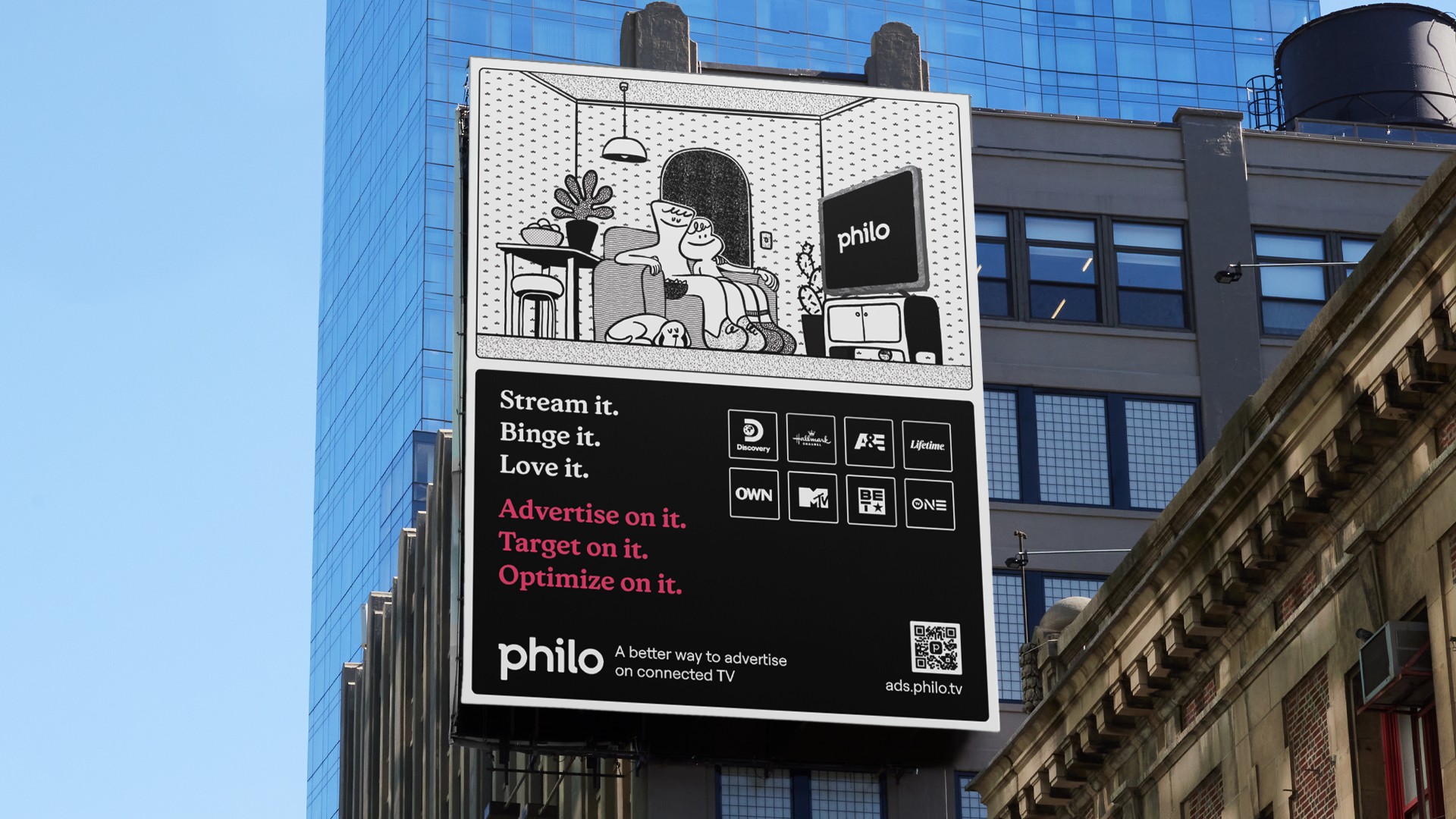 I art directed Philo’s B2B brand awareness campaign to expand ad partnerships and drive visibility with in-house media executives at major ad agencies. Built for maximum impact in the NYC market, the campaign took over high-traffic urban surfaces—from Times Square, Broadway, and Penn Station to sidewalk motion kiosks, elevator screens, coffee carts, and ice cream carts—paired with a coordinated rollout across web and paid social to reinforce frequency and recall.