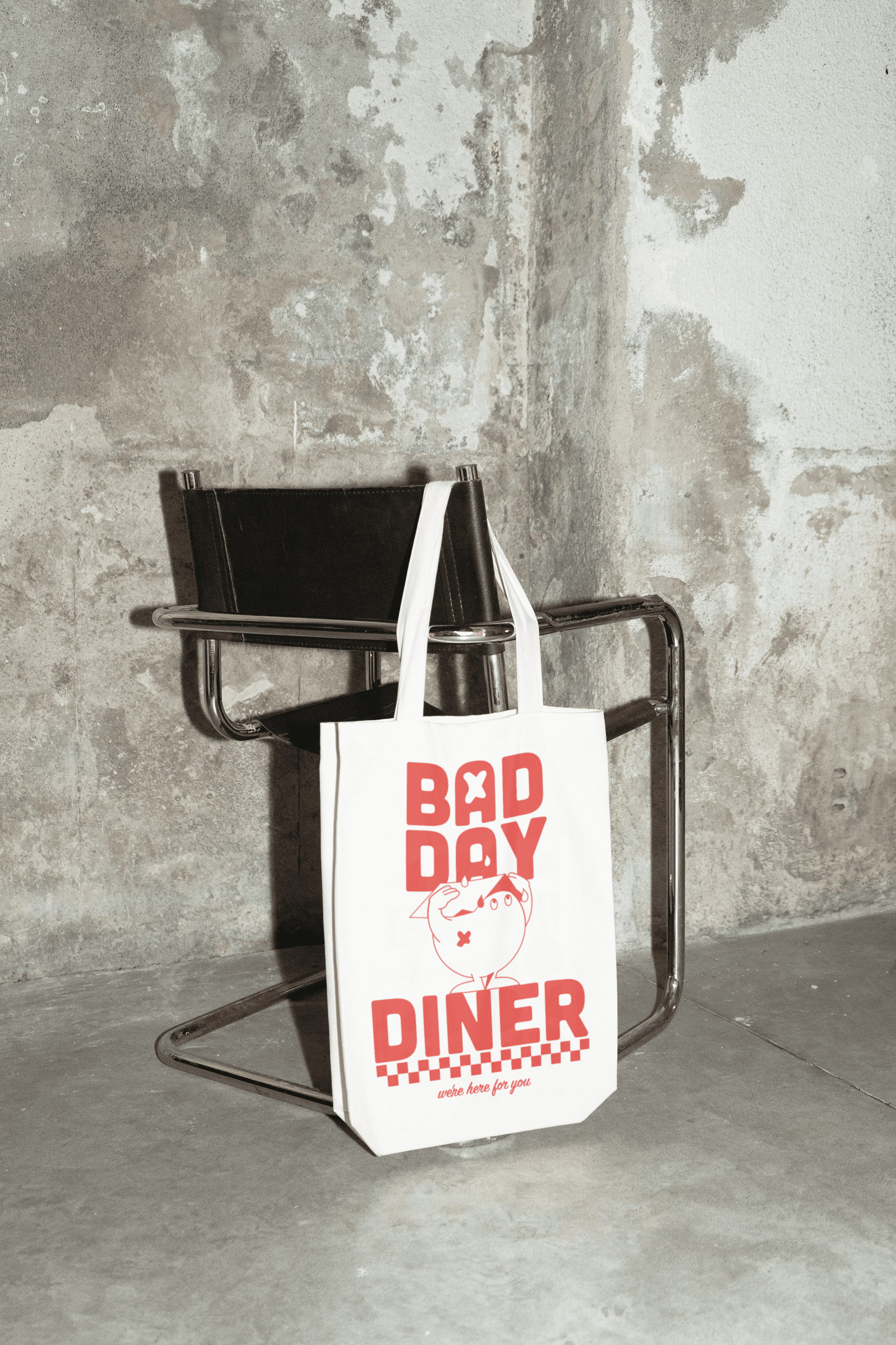 Visually, the identity nods to classic American diner culture—chrome, checkerboard floors, bold type—reimagined with a softer, more human sensibility. The logo features a small character shielding itself from the rain, a simple metaphor for vulnerability and resilience. Paired with playful illustration and tactile details, the system balances retro nostalgia with modern emotional warmth.