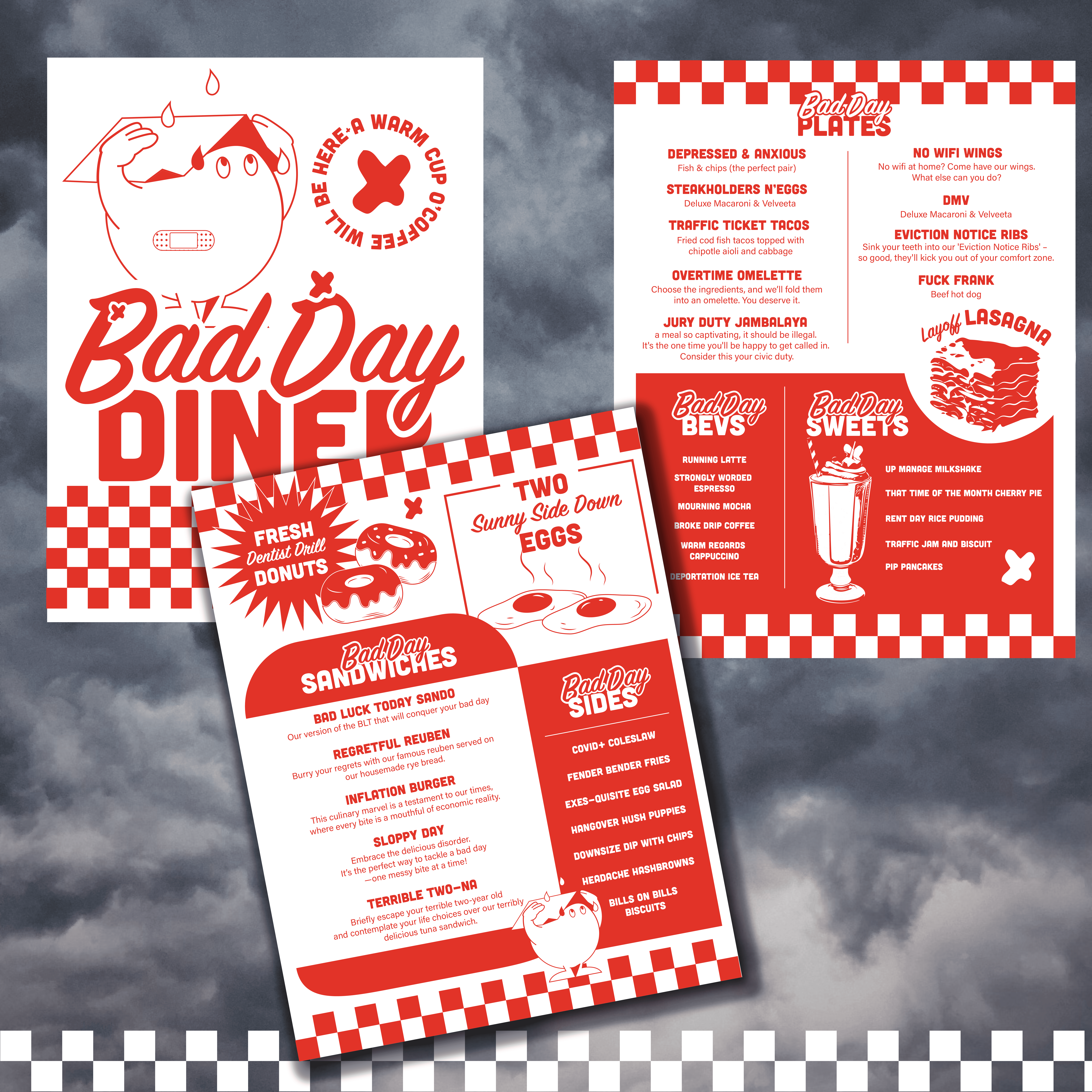 Bad Day Diner is a playful visual identity for a fictional diner built around a simple truth: everyone has bad days, and everyone deserves good comfort food when they do. The diner is imagined as a warm, judgment-free refuge—a booth to land in, a hot plate to lean on, and a little humor to take the edge off.